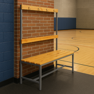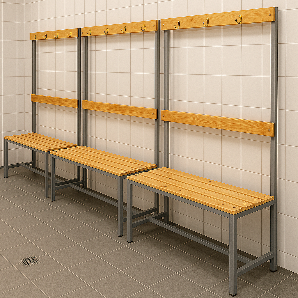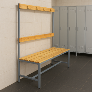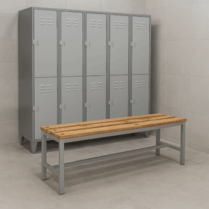 Banco de vestuario de estructura tubular de acero y laminas de madera.
